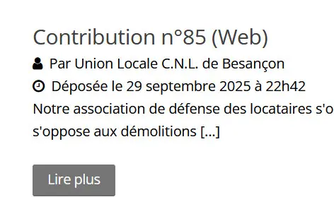 Notre association de défense des locataires s'oppose à l'artificialisation des terres aux Vaites comme elle s'oppose aux démolitions des immeubles sociaux à Planoise. La similitude entre les 2 projets est sidérante. Dans le 1er projet d'urbanisation des Vaites il était prévu d'y construire 1200 logements. Symétriquement le NPNRU prévoyait lui la démolition de 1200 logements sociaux à Planoise. Dans le 2ème projet revu à la baisse le nombre de logements à construire aux Vaites a été ramené à 600. Aujourd'hui, il y a encore 600 logements qui pourraient ne pas être détruits à Planoise. Et nous nous opposons à l'artificialisation aux vaites pour les mêmes raisons que nous nous opposons aux démolitions à Planoise:
