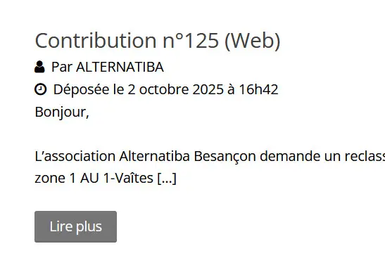 L’association Alternatiba Besançon demande un reclassement en zone A (agricole) ou N (naturelle) de la zone 1 AU 1-Vaîtes et de la zone 2AUH (à urbaniser) soumises à cette enquête publique. Nous nous opposons à la création de nouveaux immeubles et d'une nouvelle école sur ce secteur.